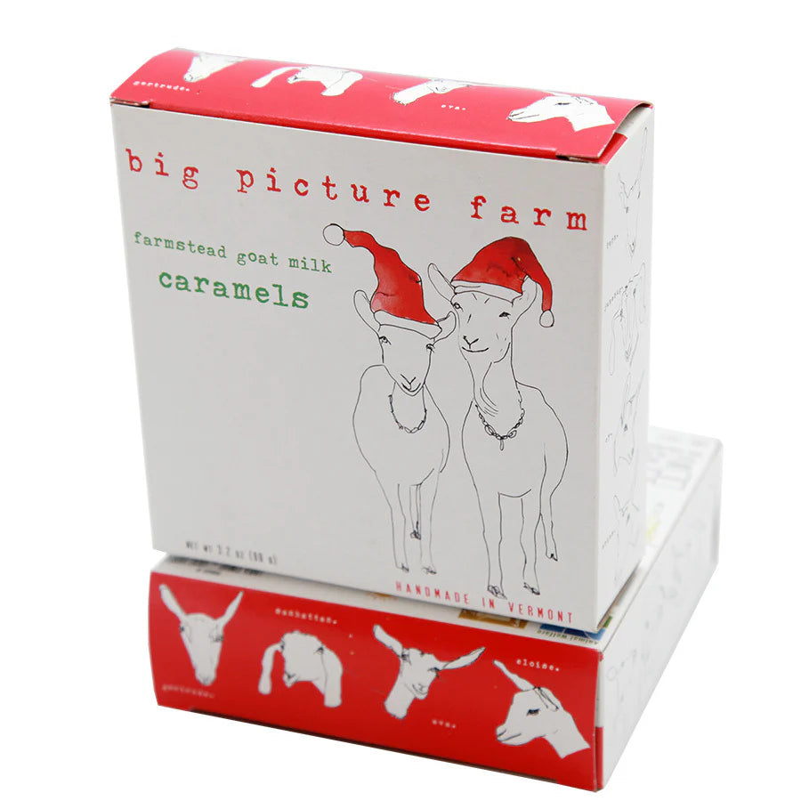 Hohoho Santa Goat is here. You didnt think the goats were going to miss out on the chance to wear a new hat did you? Contains 11 caramels. Available loaded with any of our award winning caramel iterations. Eat your heart out. These are tasty tasty little treats.